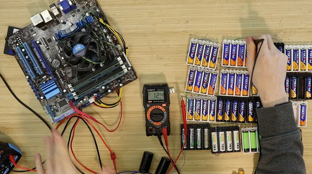 通过重新设计电池模块和电压调节电路,ScuffedBits 成功让一台台式电脑完全依靠 AA 电池运行,甚至还能跑游戏和性能测试。