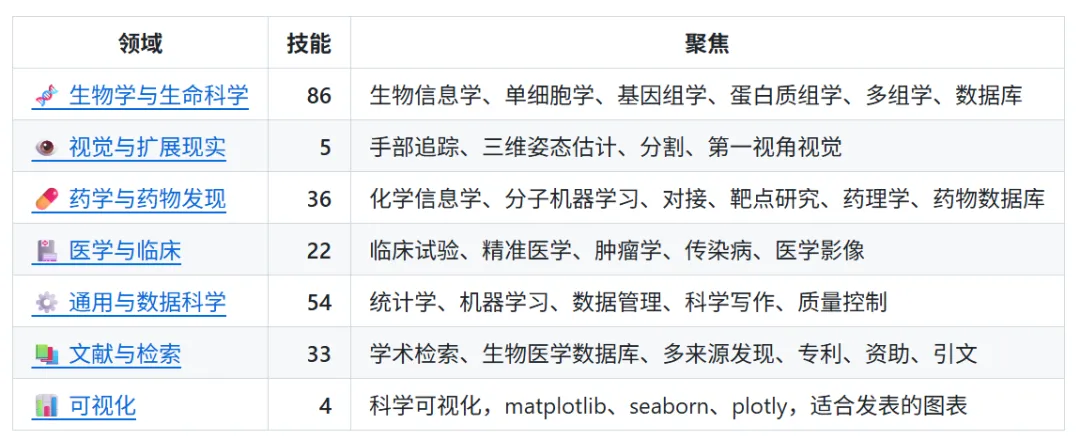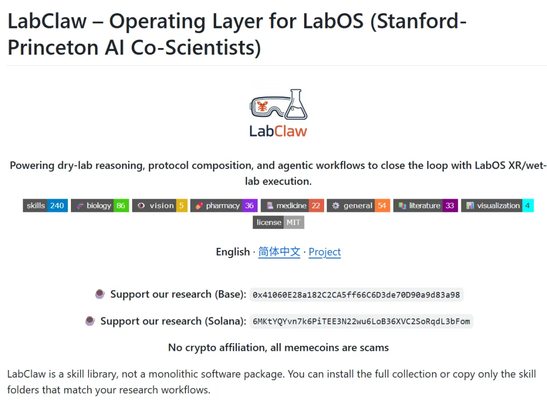 首先来看 LabClaw,是由斯坦福-普林斯顿的研究者开发,打包了用于生物医学 AI 工作流程的 240 个可投入生产的 SKILL.md 文件 ,覆盖生物学、实验室自动化、视觉/XR、药物发现、医学、数据科学、文献研究和科学可视化等领域。每个技能都教会 OpenClaw 何时使用某个工具、 如何调用该工具,以及应产生何种输出。其实也就是 OpenClaw 的附属,让智能体不是临场发挥,而是基于明确的技能组织去完成任务。