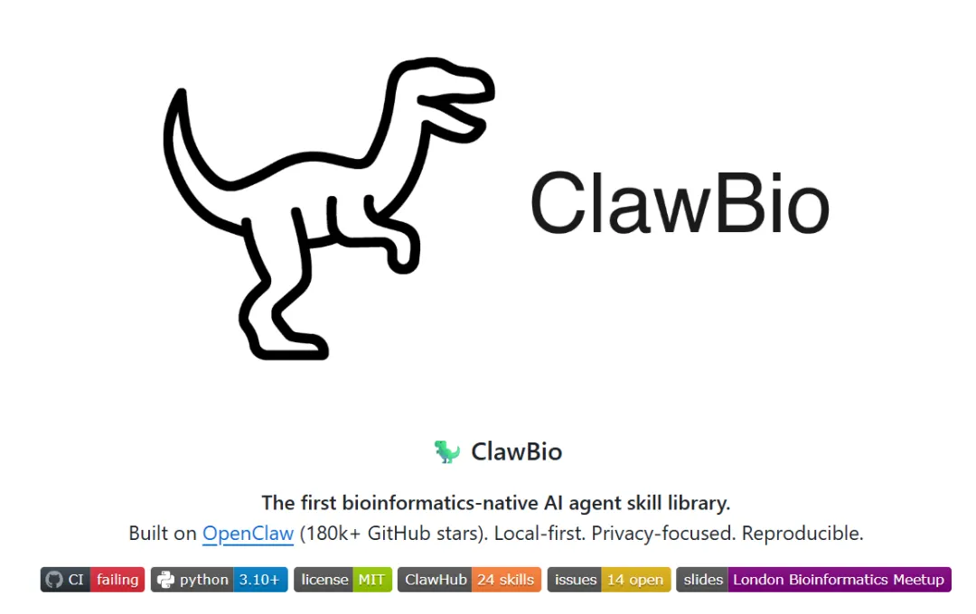 # MedgeClaw 架构示意User (voice / text via WhatsApp · Slack · Feishu · Discord) ↓OpenClaw Gateway (conversation layer) ↓ biomed-dispatch skillClaude Code (execution layer) ↓ K-Dense Scientific Skills (140 skills)R + Python Analysis Environment (Docker) ↓ ↓ ↓Research Dashboard :77xx RStudio :8787 Feishu Rich Cards (real-time progress, / JupyterLab :8888 (SVG panels → PNG code & output preview) (interactive) → interactive cards)下一个要介绍的是更加稳健的ClawBio,项目贴近发文章层面非常核心的要求,那就是可复现性。很多时候,做分析最重要的并不是跑出了结果,而是这个结果以后还能不能被重新跑出来,别人能不能验证。ClawBio 关注的不只是让智能体去完成生信任务,还强调这些任务应当尽量在本地环境中完成,并留下清楚的执行记录、命令信息和环境说明。每个结果都附带可复现性包,让审稿人可以在 30 秒内复现你的图 3,而无需给你发邮件。
