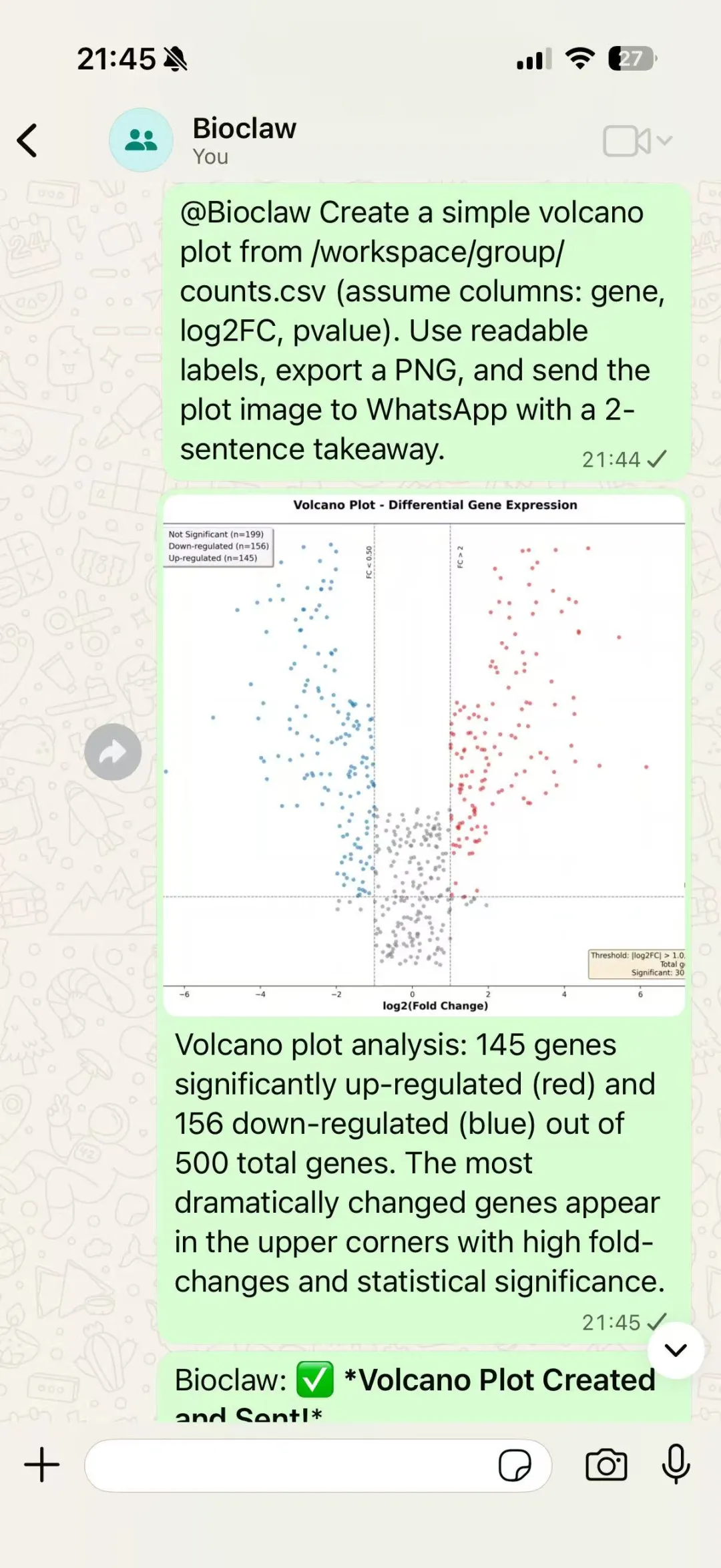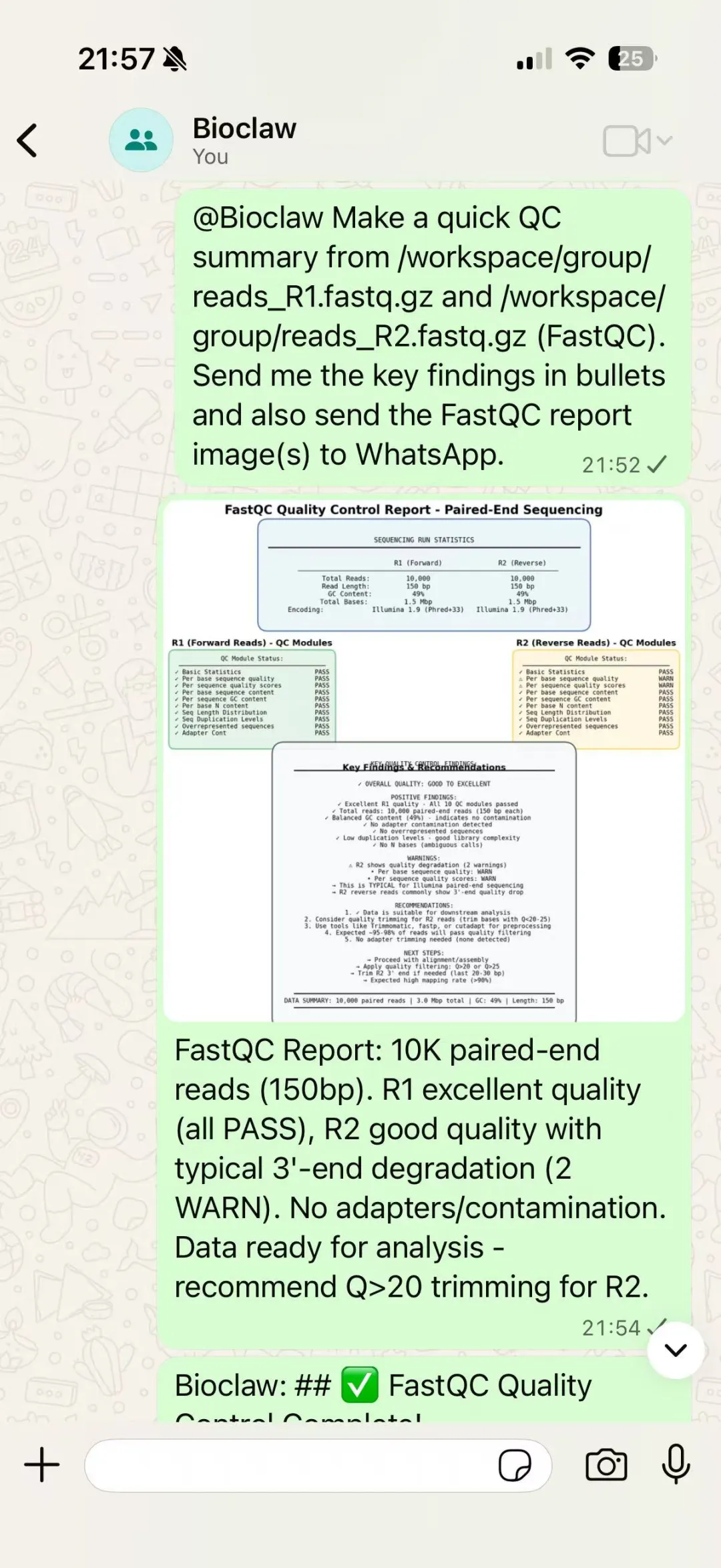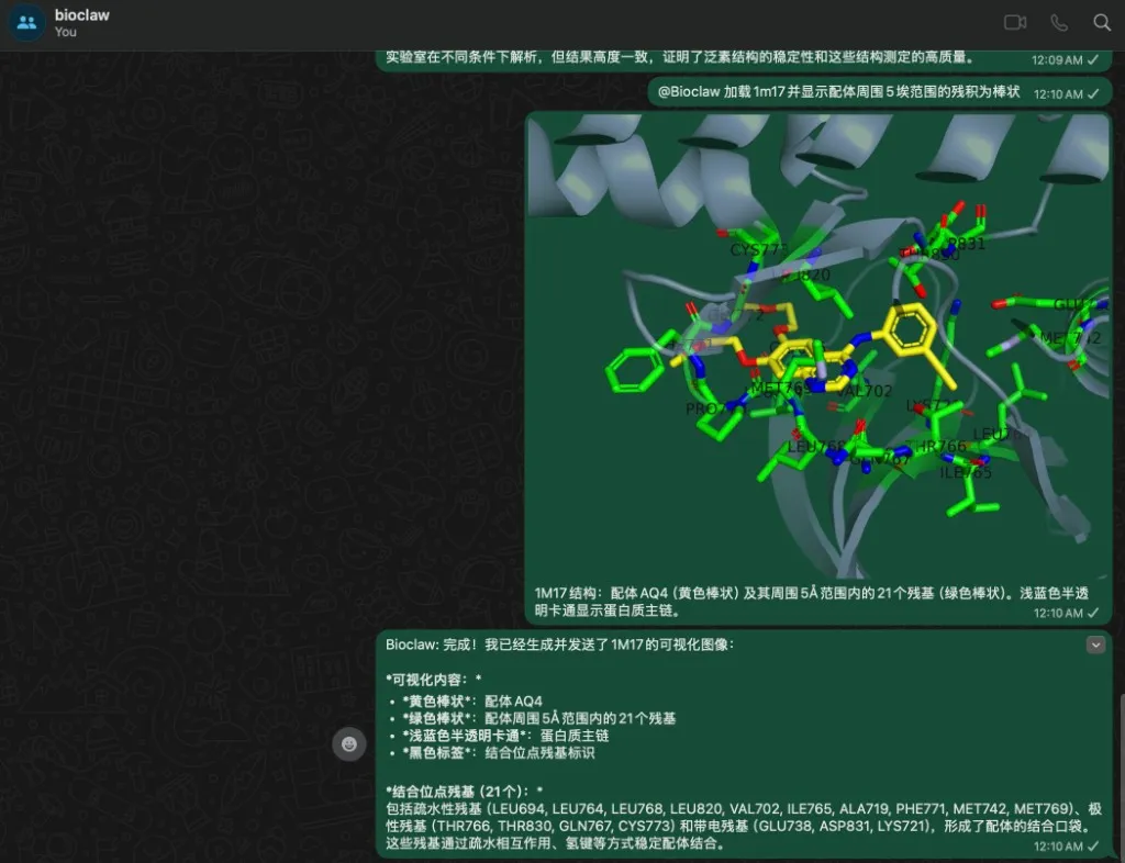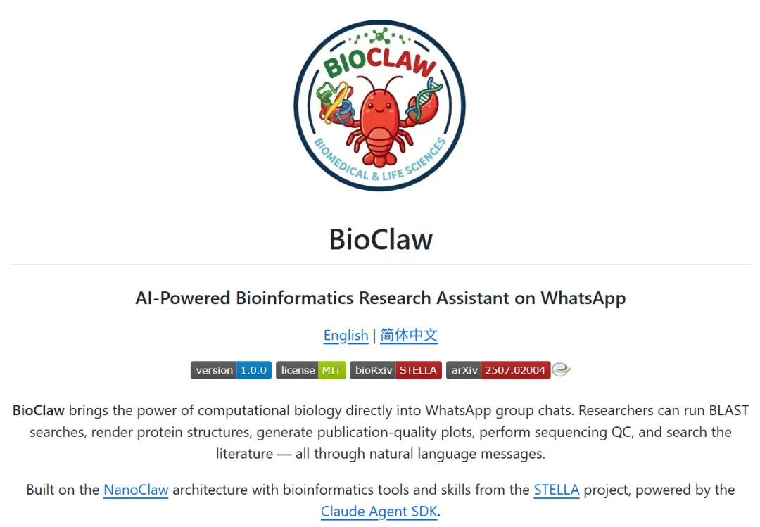 最后要介绍的是 BioClaw。如果说前面几个项目主要在处理技能、流程和执行的问题,那么 BioClaw 则更接近使用结果这个层面。它的一大特点,是将计算生物学相关能力直接嵌入了群聊环境之中,例如 WhatsApp 这样的日常沟通场景。