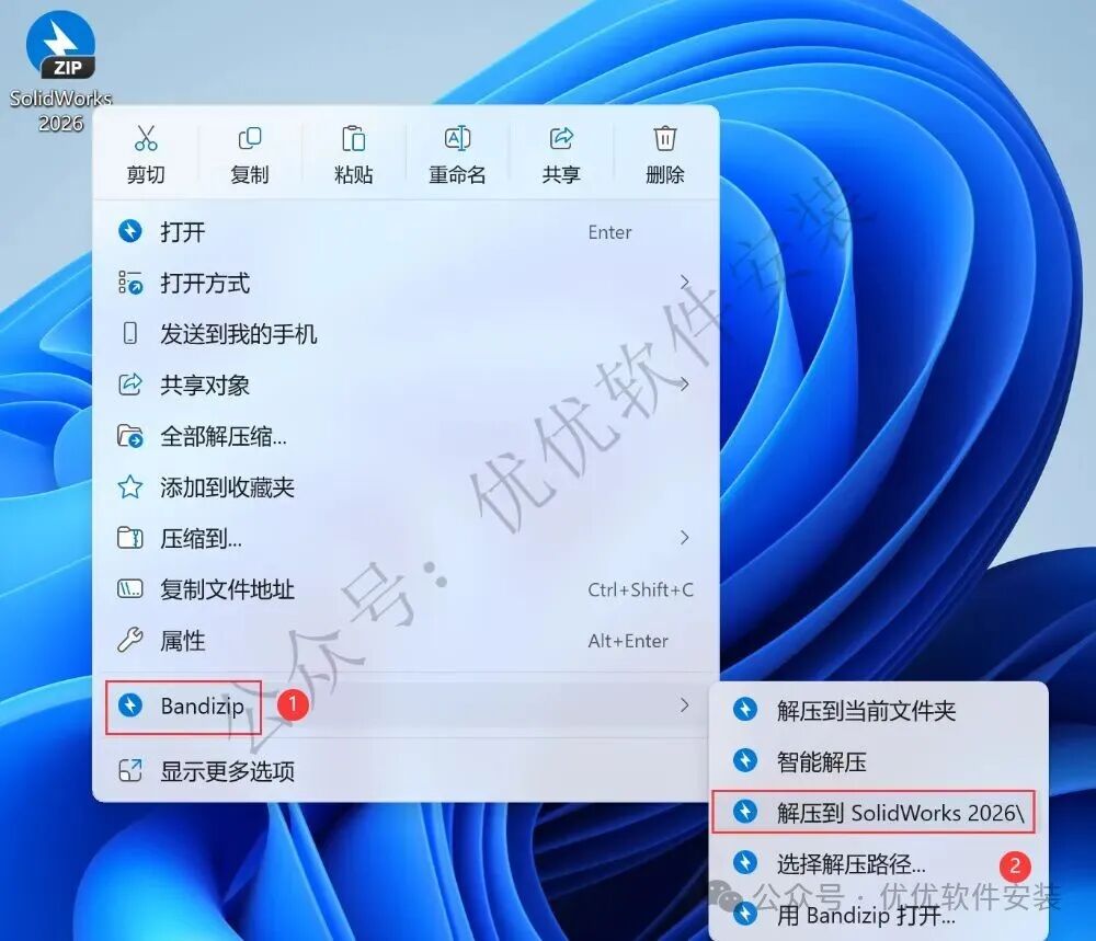 1、下载SolidWorks 2026软件安装包到电脑上,右键选择【解压到SolidWorks 2026\】