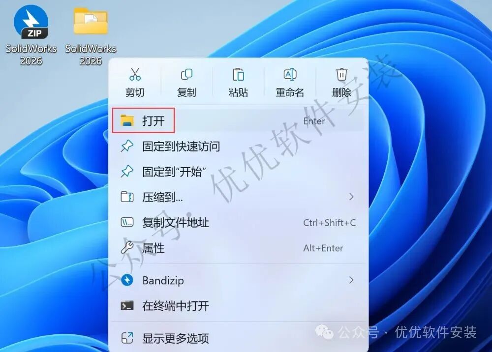 35、回到桌面,右键桌面上的【SolidWorks 2026软件图标】,点击【打开】