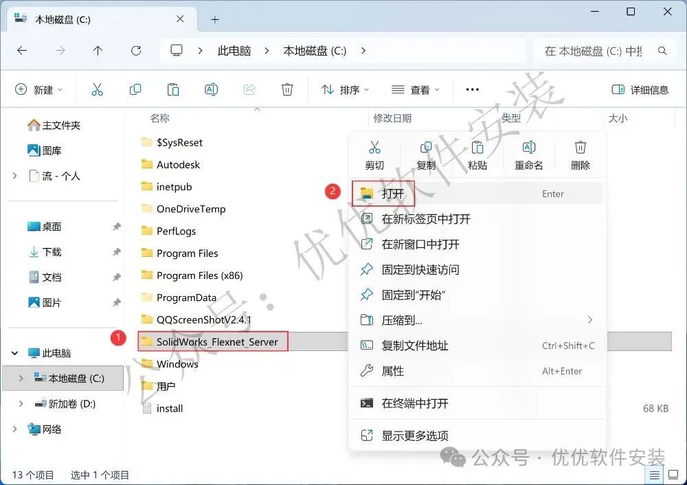 9、找到粘贴的【SolidWorks_Flexnet_Server】文件夹,右键【打开】它