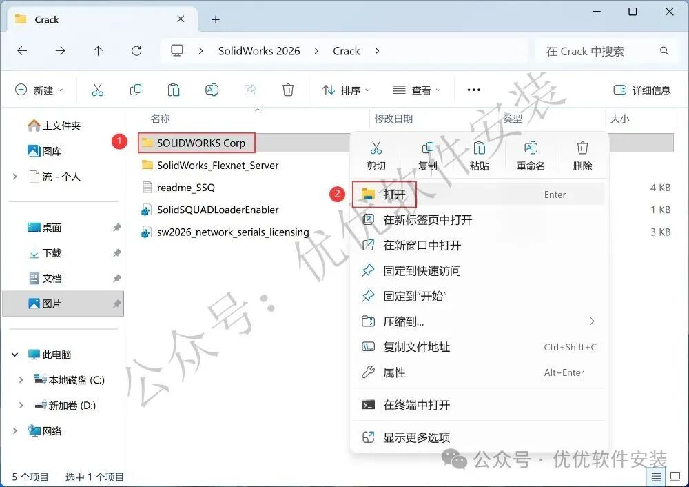 30、回到Crack文件夹,找到【SOLIDWORKS Corp】文件夹,右键【打开】它