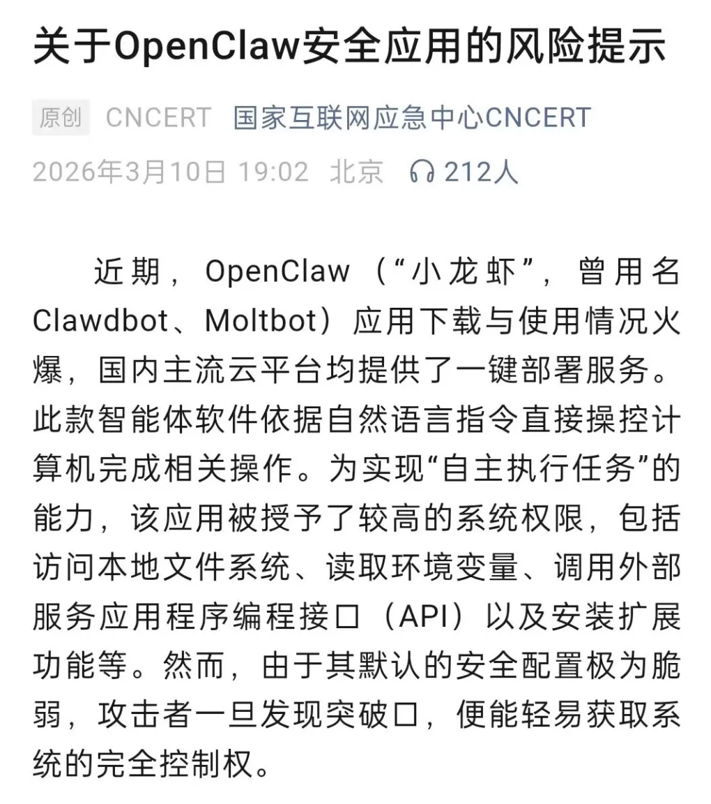 国家互联网应急中心 3 月 10 日连发警示:默认安全配置极度薄弱,可能被窃取密钥、植入恶意代码,建议 “隔离运行 + 关闭自动更新”。更狠的是:国企 / 政府部门已收到 “立即停用” 通知,连员工私人手机接入公司网络都被禁止,军方家属也被纳入管控范围!