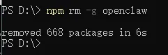 OpenClaw卸载方法(一键卸载、彻底清理)如果是用OpenClaw官网提供的一键部署的方式安装的OpenClaw,可以用命令一键卸载OpenClaw;首先查看电脑中的OpenClaw是不是npm安装的,打开PowerShell,命令如下,可以查看openclaw:npm list -g --depth=0使用命令卸载:npm rm -g openclaw删除缓存文件:或者用命令删除Remove-Item -Recurse -Force "$env:USERPROFILE\.openclaw"至此,openclaw在本地计算机彻底卸载完成!!