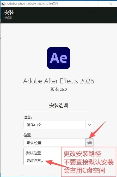 安装位置改到D盘,新建个文件夹放进去,千万别扔在C盘。C盘太满了电脑会变卡,影响运行速度