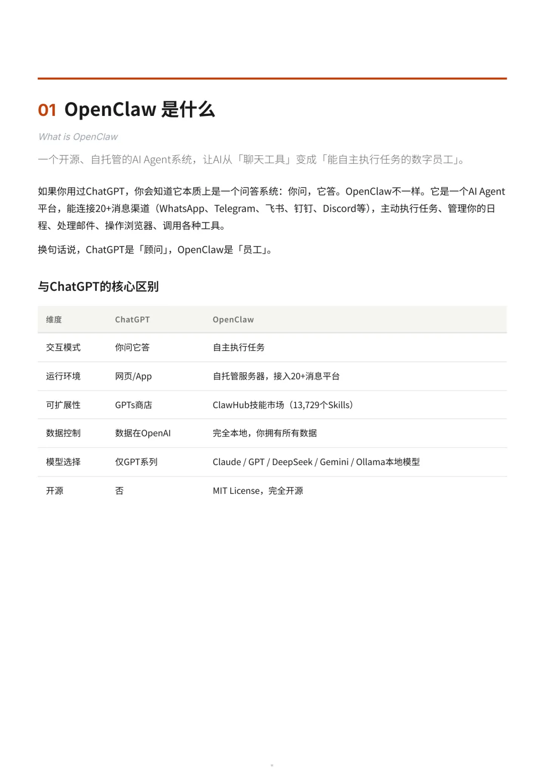 核心定义:开源自托管 AI Agent 系统,被称作 “个人 AI 操作系统”,区别于 ChatGPT 的 “问答顾问” 定位,它是能自主执行任务的 “数字员工”,数据完全本地可控,支持 20 + 消息渠道接入,MIT 协议完全开源,吉祥物为龙虾,中文社区称使用为 “养虾”。