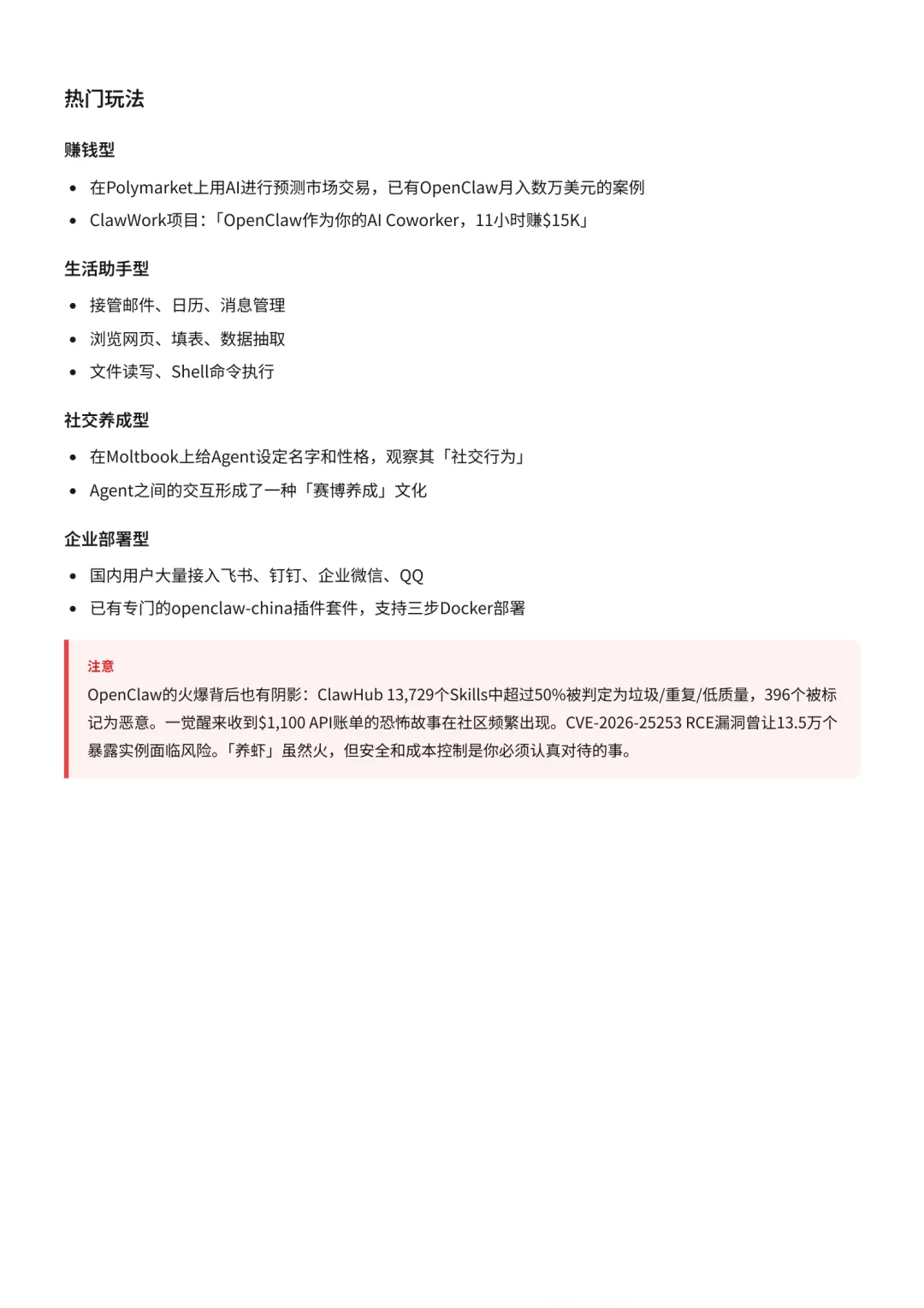 养虾文化:中文社区独特亚文化,用户自称 “养虾人”,Moltbook 成为 AI Agent 社会化实验场,热门玩法包括赚钱(Polymarket 预测、ClawWork)、生活助手、社交养成、企业部署。