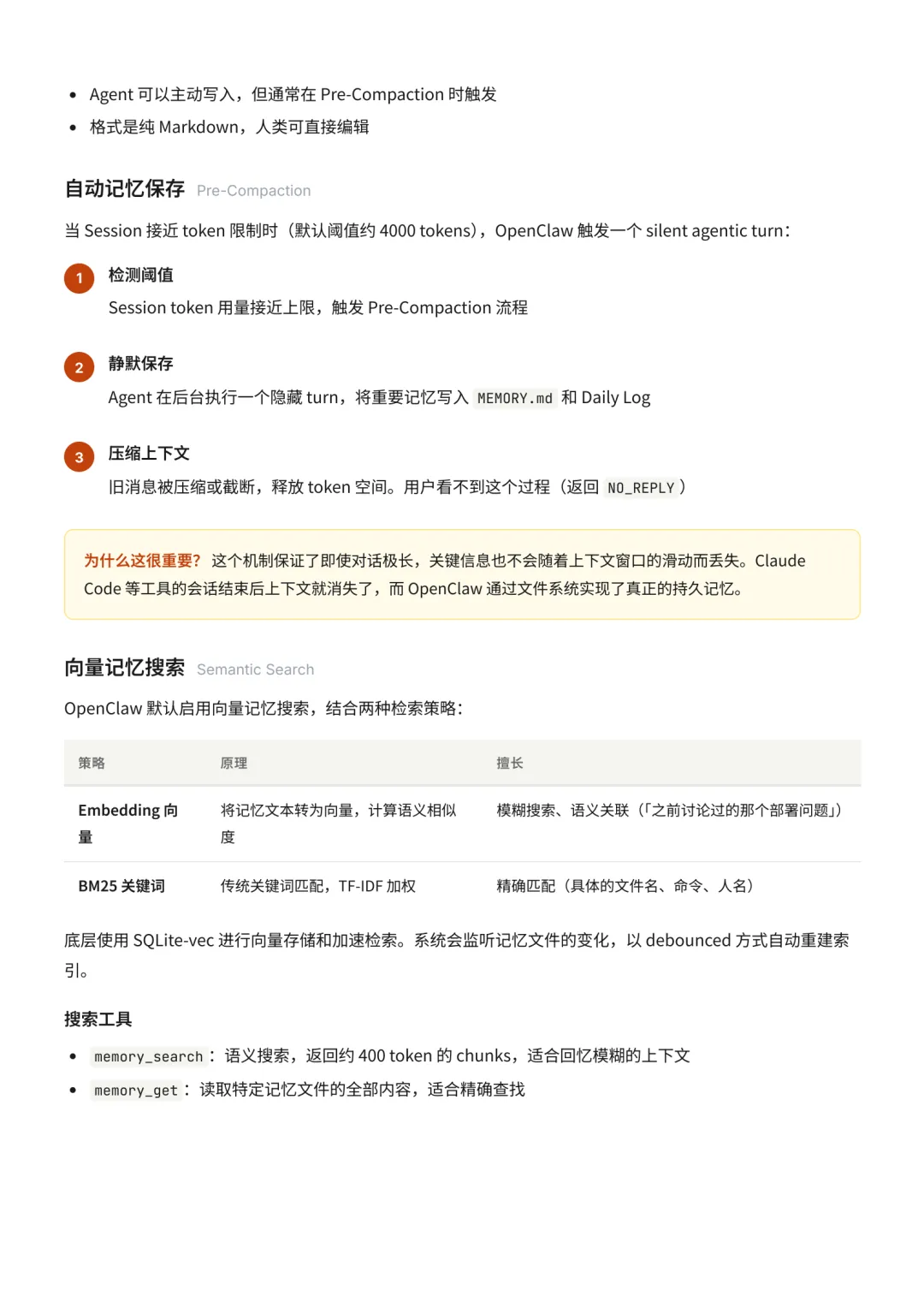 四层记忆系统:SOUL(永久人格内核)、TOOLS(按需加载技能)、USER(用户持久化偏好)、Session(会话级实时上下文),搭配日志系统、向量记忆搜索,实现真正的持久化记忆,解决普通 Chatbot 上下文丢失问题。