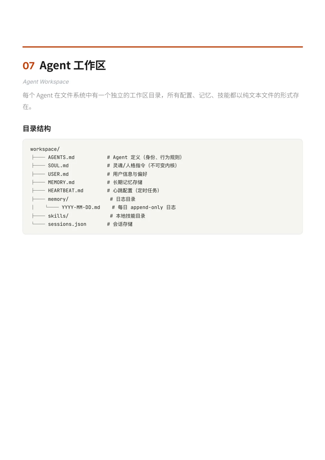 Agent 工作区:所有配置、记忆、技能以纯文本文件存储,遵循 “一切皆文本” 理念,支持用户直接用编辑器修改,工作区有明确的目录结构和核心文件分工。