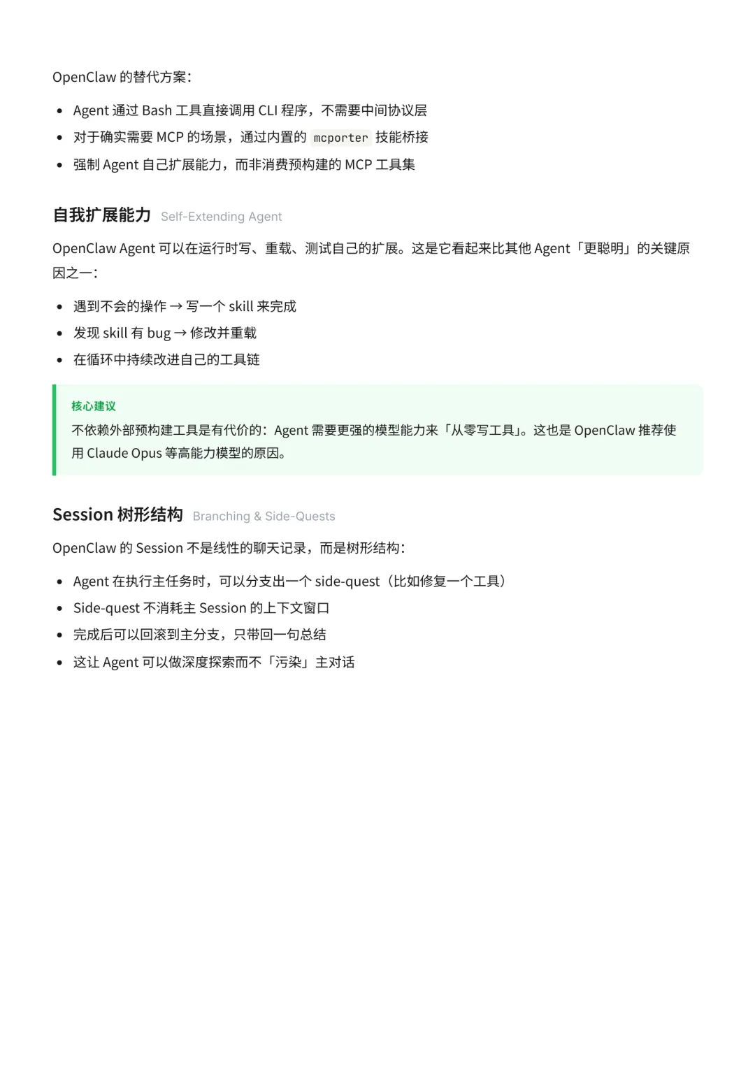 设计哲学:继承 Unix 小工具、可组合、文本流理念,极简设计仅保留 4 个核心工具,拒绝 MCP 协议转而用 CLI 实现可扩展性,Agent 支持运行时自我扩展能力,会话采用树形结构支持分支探索,代码规模约 43 万行 TypeScript,运行内存约 1GB,启动快且可 24/7 运行。