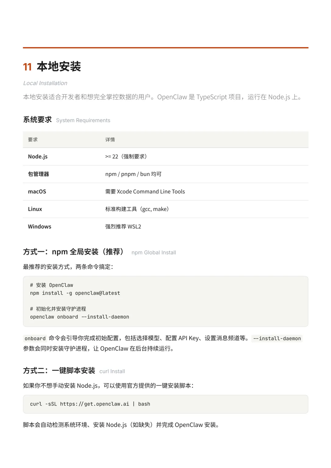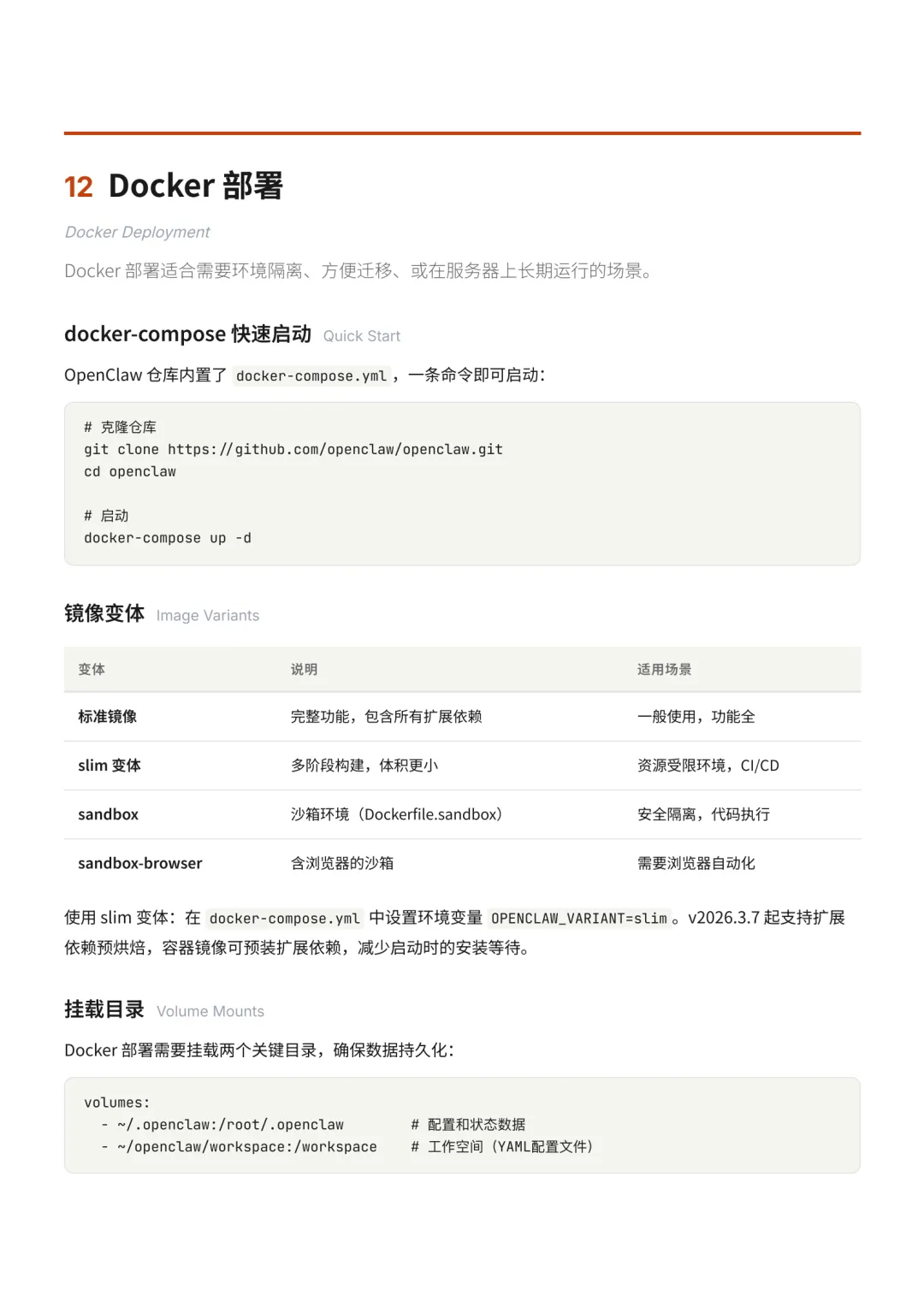 命令速查表:涵盖安装更新、日常使用、插件管理、模型认证、聊天、Docker 部署等常用命令。