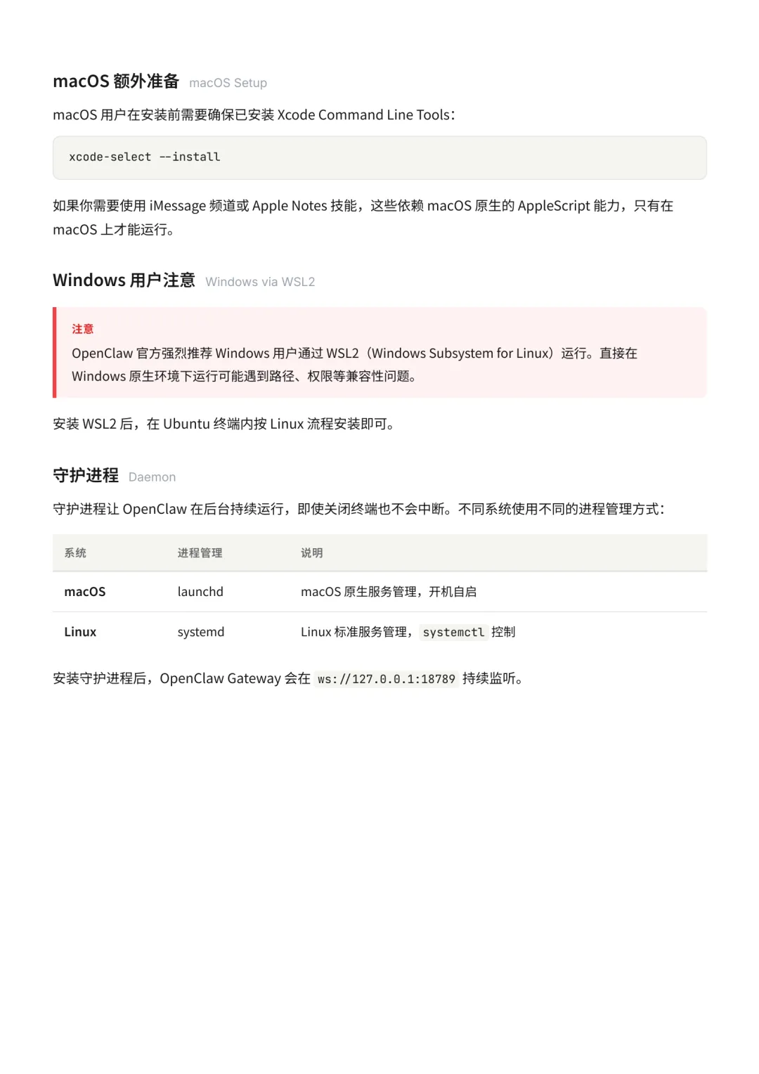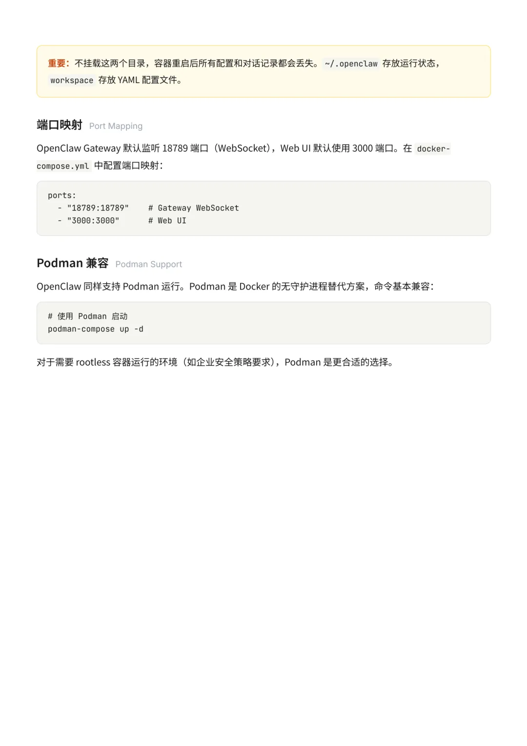 远程访问方案:推荐 Tailscale Serve/Funnel(官方首选),也可通过 SSH 端口转发,内置 Web UI 支持管理和监控,macOS 有菜单栏伴侣应用,iOS/Android 客户端正在开发。