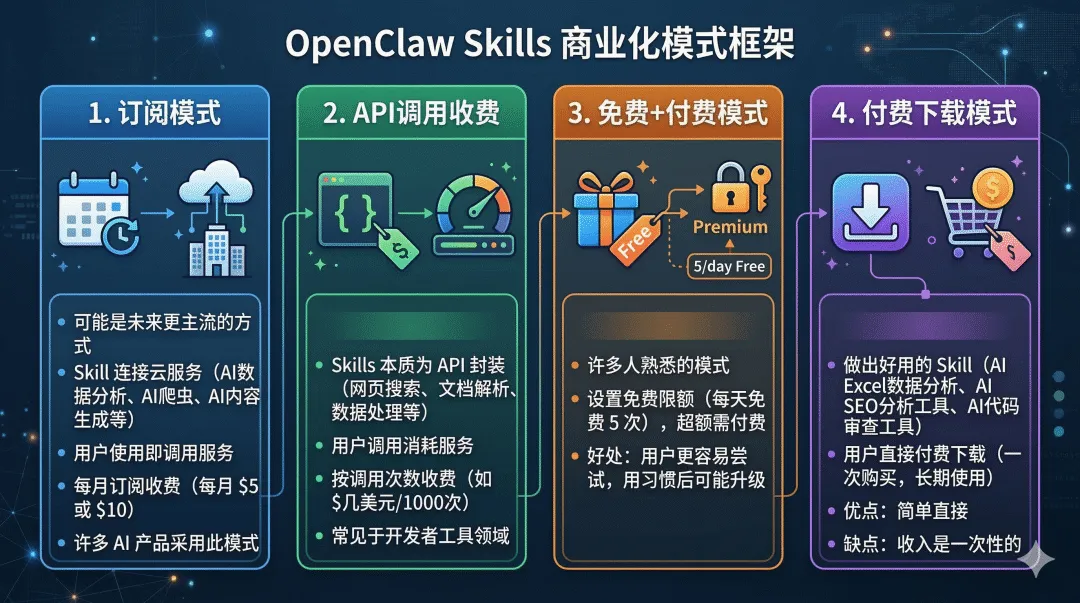 那问题来了:Skills 怎么赚钱?我自己思考下来,大概有几种可能的模式,先上图哈哈。