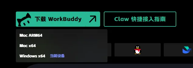 WorkBuddy支持Mac和Windows,选择官方首页左下角的下载按钮,自动适配当前电脑的下载包,将客户端下载到本地。
