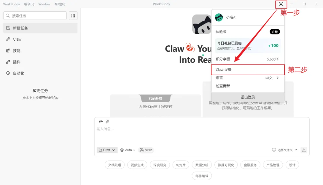 依次点击右上角的头像---Claw设置