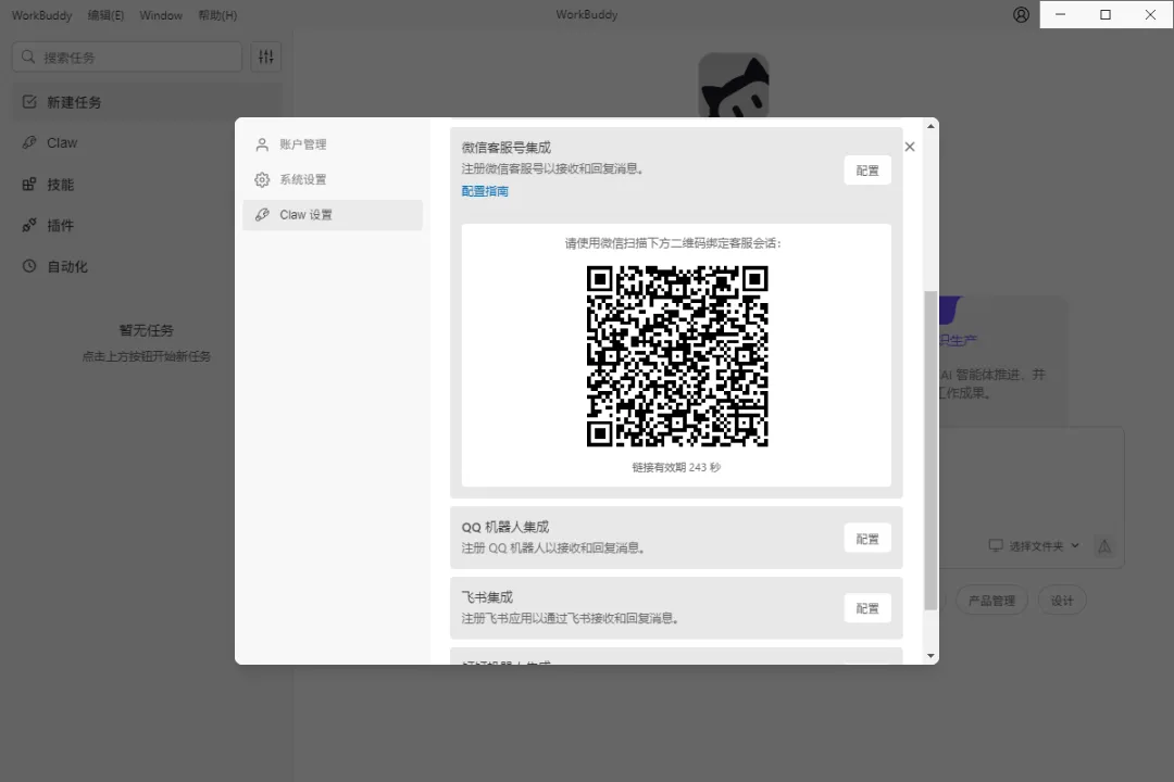 同时,WorkBuddy也支持一键集成QQ、企业微信、飞书、钉钉等。