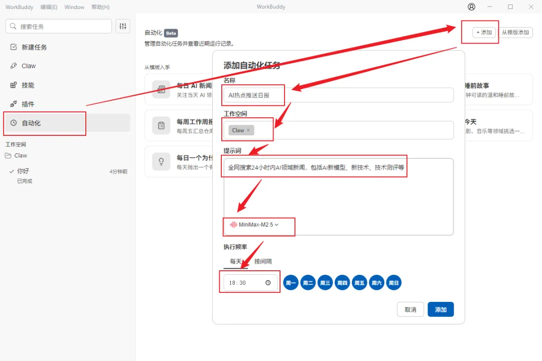同时还可以使用自动化功能,定时推送指定消息。下图为其中的配置示例。