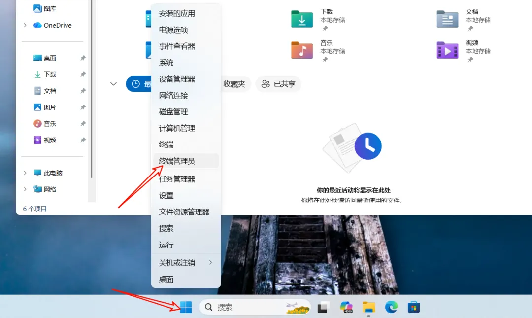 鼠标右键点击windows微标键,点击终端管理员。