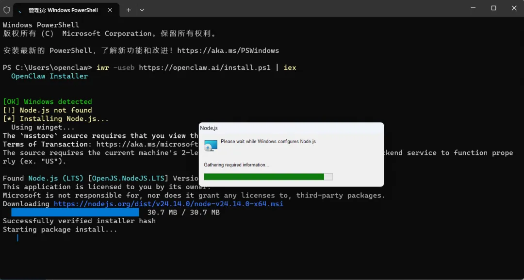 iwr -useb https://openclaw.ai/install.ps1 | iex这条命令是 OpenClaw 官方提供的 Windows 一键安装命令,核心作用是「从远程服务器下载 OpenClaw 的安装脚本,并直接在本地执行」。