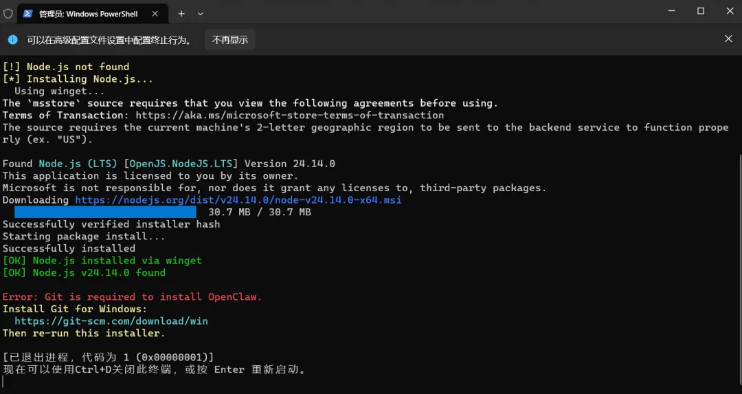 Error: Git is required to install OpenClaw.Install Git for Windows: https://git-scm.com/download/winThen re-run this installer.[已退出进程,代码为 1 (0x00000001)]现在可以使用Ctrl+D关闭此终端,或按 Enter 重新启动。