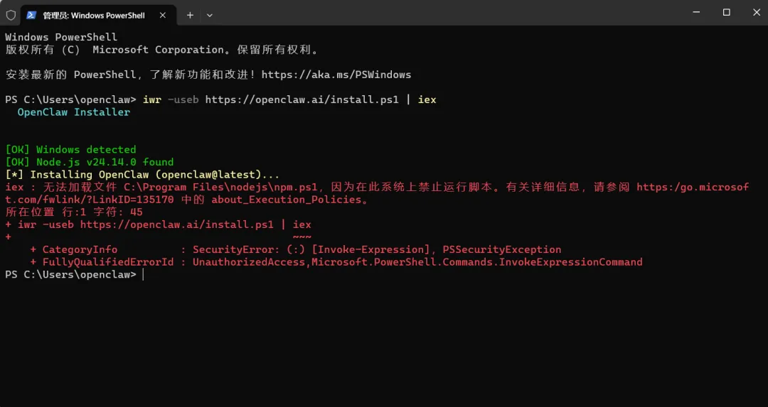 iwr -useb https://openclaw.ai/install.ps1 | iex再次运行安装命令(我勒个去😢!)你可能还会遇到如下错误(不能运行脚本了😂):