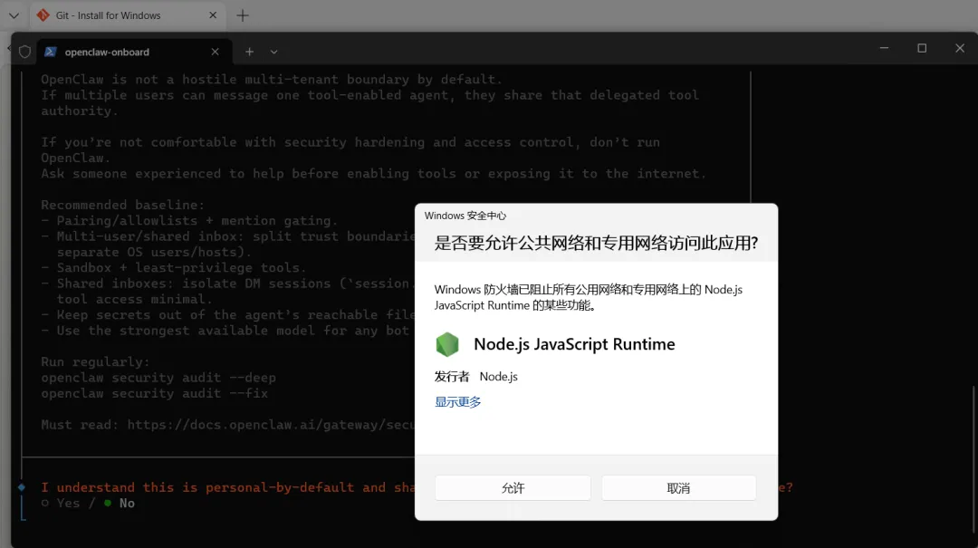 Nodejs提示访问网络,点击 允许。