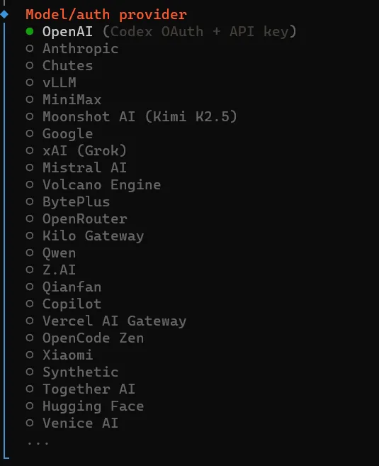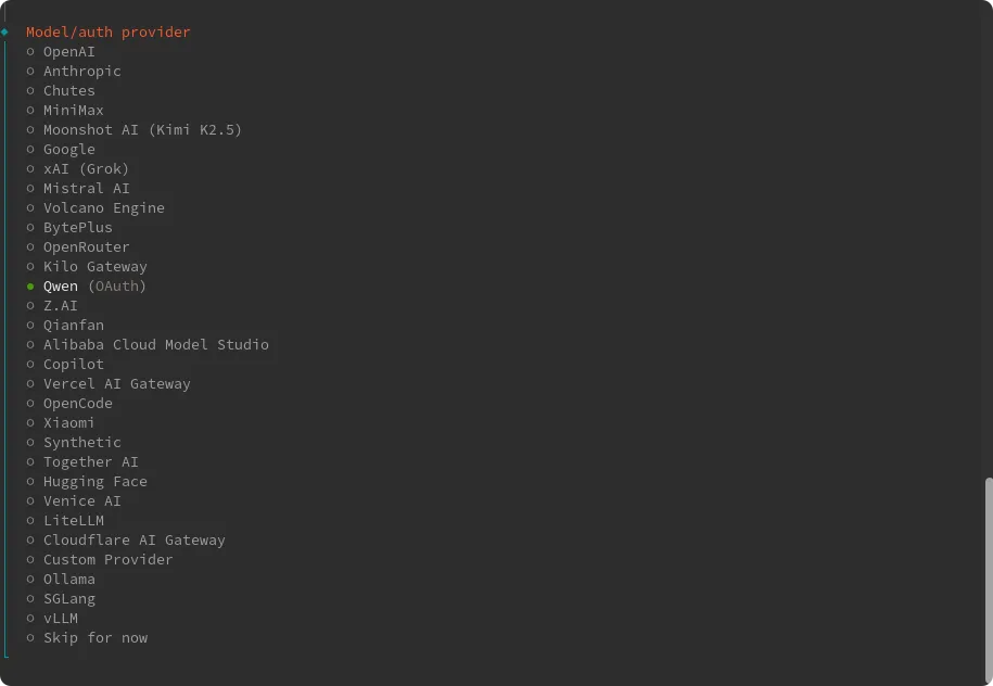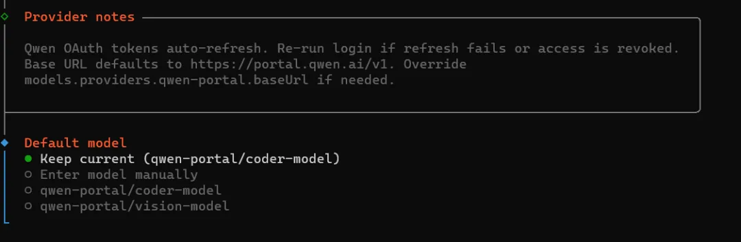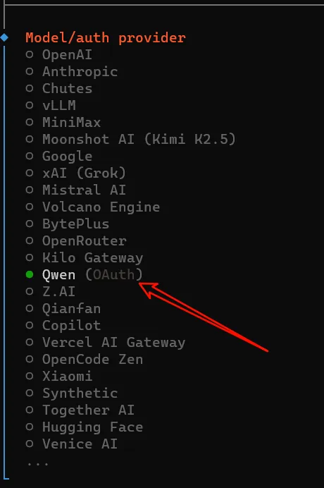 选择模型供应商,如果你已经有对应模型供应商API可以直接选择(键盘上下键选择),如果没有这里直接选择千问(Qwen)回车继续。
