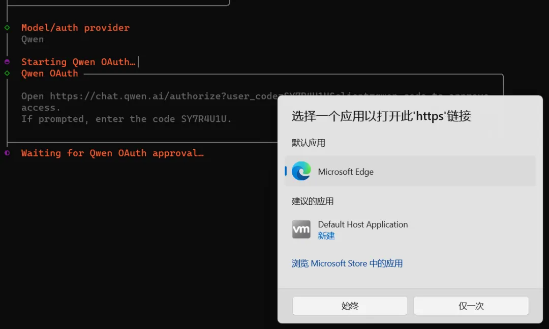 点击始终会打开浏览器进行千问登录认证,登录后即可成功认证,如果没有千问账号,直接注册登录认证即可。