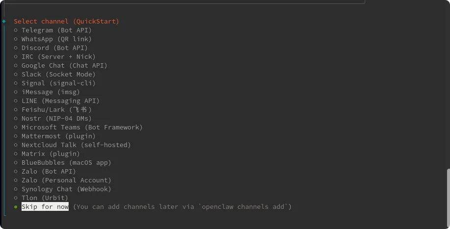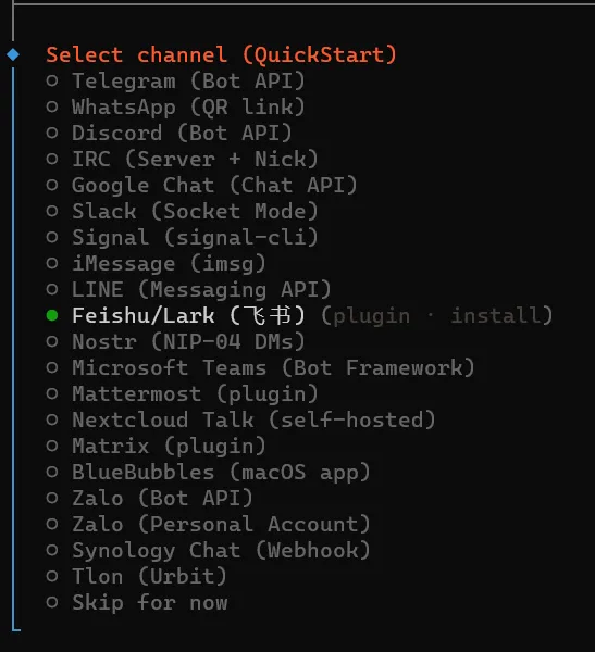 这一步由于我们在国内,直接选择飞书,以接入 飞书(Feishu) 为例。