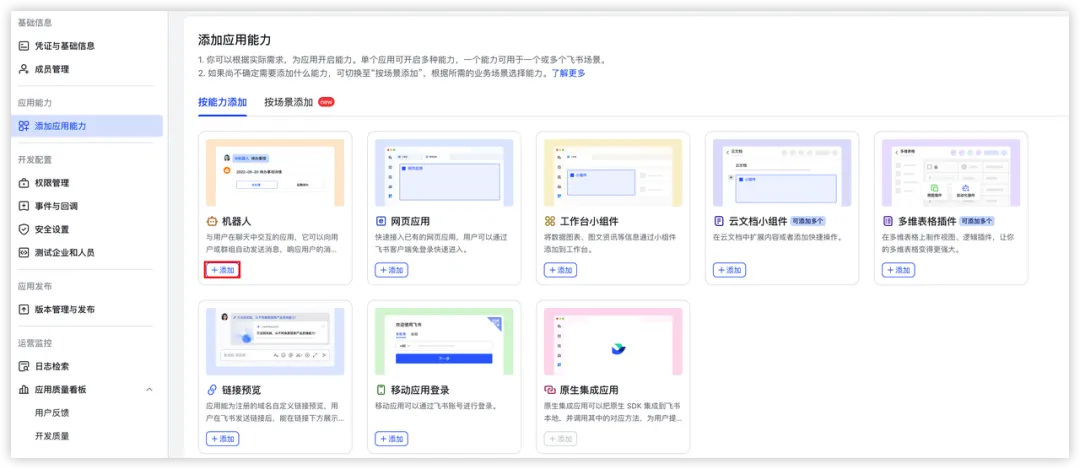5、选择“按能力添加”页签,单击“机器人”能力卡片的“添加”按钮。