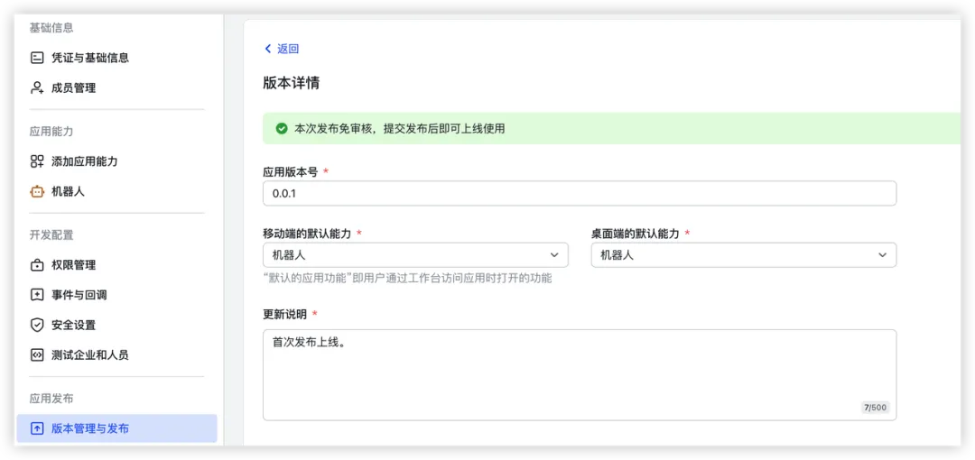 8、按需配置应用版本号、默认能力及更新说明等信息。了解更多。