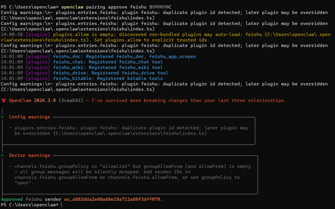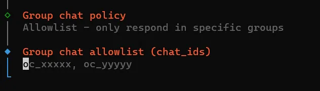 这里让你输入允许 OpenClaw 自动回复的飞书群 ID,多个群用英文逗号 , 隔开。