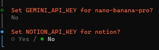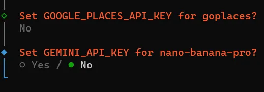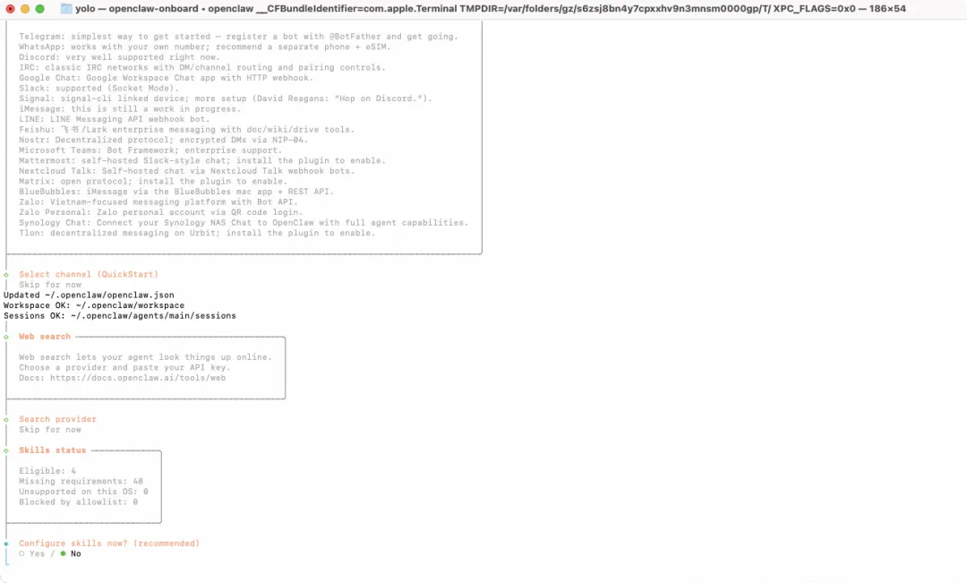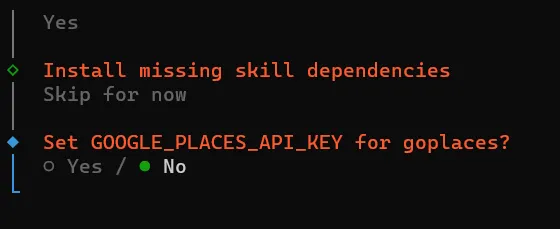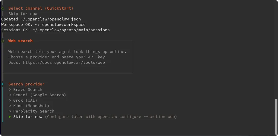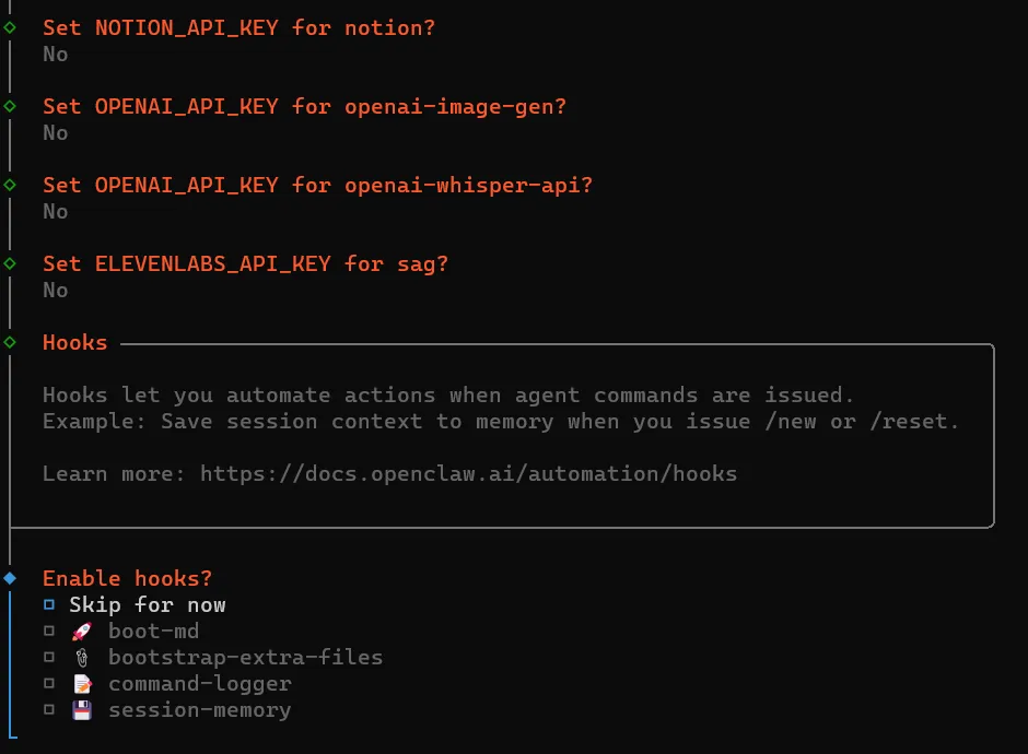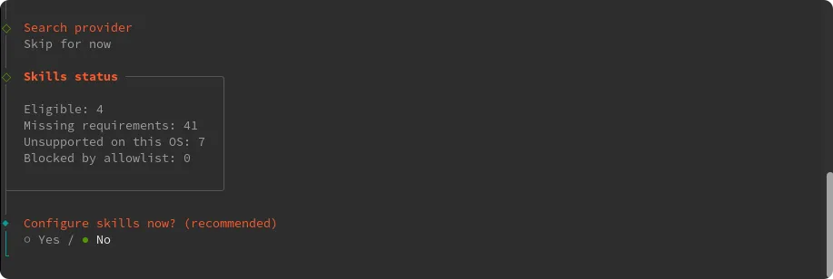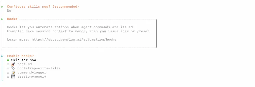 Install missing skill dependencies│ ◻ Skip fornow (Continue without installing dependencies)│ ◻ 🔐 1password│ ◻ 📰 blogwatcher│ ◻ 🫐 blucli│ ◻ 📸 camsnap│ ◻ 🧩 clawhub│ ◻ 🎛️ eightctl│ ◻ ♊️ gemini│ ◻ 🧲 gifgrep│ ◻ 🐙 github│ ◻ 🎮 gog│ ◻ 📍 goplaces│ ◻ 📧 himalaya│ ◻ 📦 mcporter│ ◻ 🍌 nano-banana-pro│ ◻ 📄 nano-pdf│ ◻ 💎 obsidian│ ◻ 🎙️ openai-whisper│ ◻ 💡 openhue│ ◻ 🧿 oracle│ ◻ 🛵 ordercli│ ◻ 🗣️ sag│ ◻ 🌊 songsee│ ◻ 🔊 sonoscli│ ...└按方向键↑/↓移动光标到 ◻ Skip for now 这一行,按空格键勾选(方块变实心 ◼),然后按回车键确认;