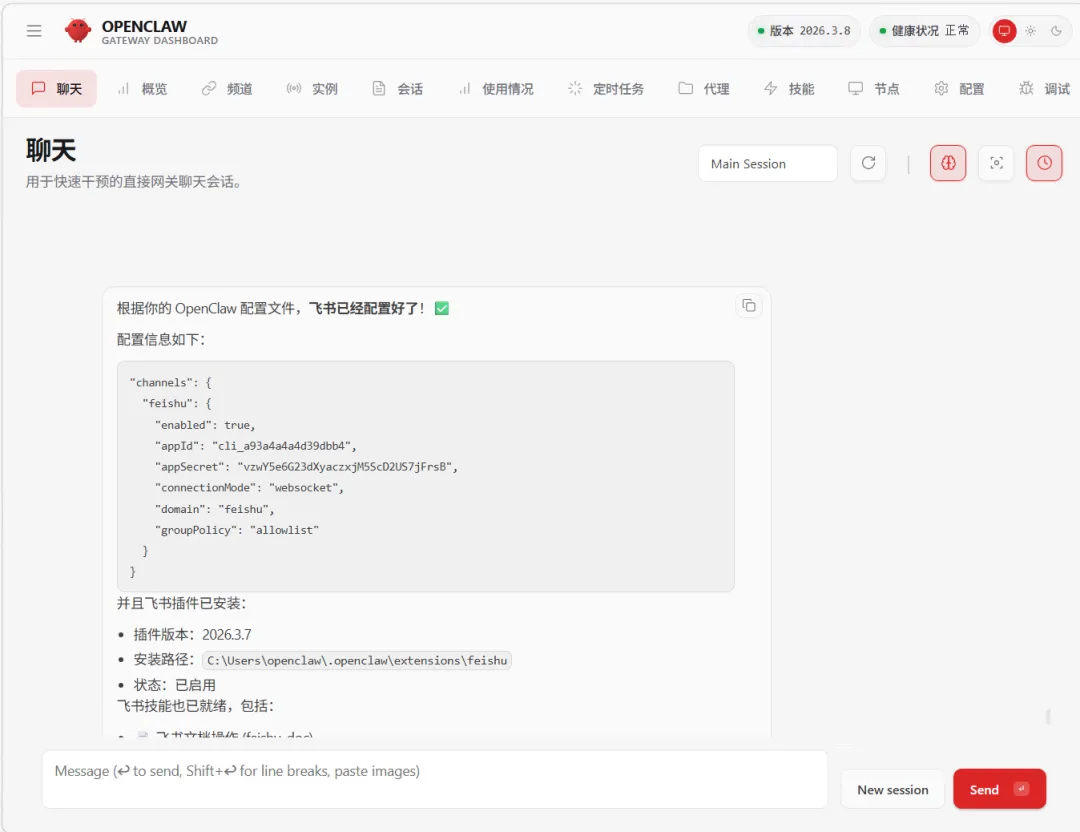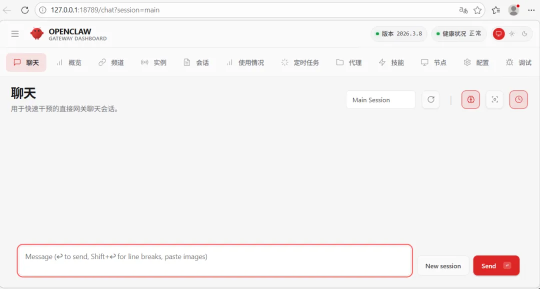 初始化完毕,就会自动打开OpenClaw的WEB UI浏览器界面。