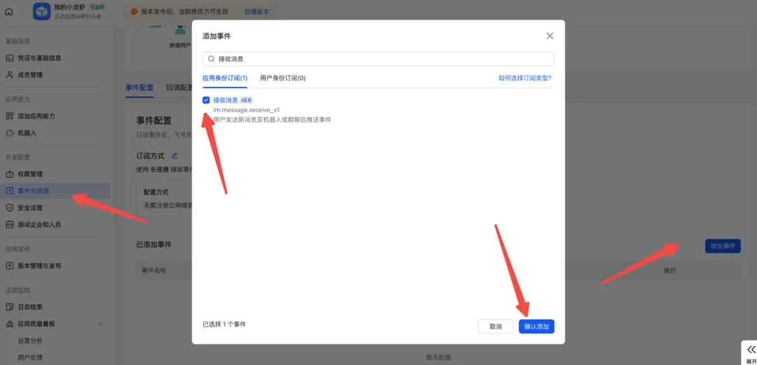 {"scopes": {"tenant": ["contact:contact.base:readonly","docx:document:readonly","im:chat:read","im:chat:update","im:message.group_at_msg:readonly","im:message.p2p_msg:readonly","im:message.pins:read","im:message.pins:write_only","im:message.reactions:read","im:message.reactions:write_only","im:message:readonly","im:message:recall","im:message:send_as_bot","im:message:send_multi_users","im:message:send_sys_msg","im:message:update","im:resource","application:application:self_manage","cardkit:card:write","cardkit:card:read" ],"user": ["contact:user.employee_id:readonly","offline_access","base:app:copy","base:field:create","base:field:delete","base:field:read","base:field:update","base:record:create","base:record:delete","base:record:retrieve","base:record:update","base:table:create","base:table:delete","base:table:read","base:table:update","base:view:read","base:view:write_only","base:app:create","base:app:update","base:app:read","sheets:spreadsheet.meta:read","sheets:spreadsheet:read","sheets:spreadsheet:create","sheets:spreadsheet:write_only","docs:document:export","docs:document.media:upload","board:whiteboard:node:create","board:whiteboard:node:read","calendar:calendar:read","calendar:calendar.event:create","calendar:calendar.event:delete","calendar:calendar.event:read","calendar:calendar.event:reply","calendar:calendar.event:update","calendar:calendar.free_busy:read","contact:contact.base:readonly","contact:user.base:readonly","contact:user:search","docs:document.comment:create","docs:document.comment:read","docs:document.comment:update","docs:document.media:download","docs:document:copy","docx:document:create","docx:document:readonly","docx:document:write_only","drive:drive.metadata:readonly","drive:file:download","drive:file:upload","im:chat.members:read","im:chat:read","im:message","im:message.group_msg:get_as_user","im:message.p2p_msg:get_as_user","im:message:readonly","search:docs:read","search:message","space:document:delete","space:document:move","space:document:retrieve","task:comment:read","task:comment:write","task:task:read","task:task:write","task:task:writeonly","task:tasklist:read","task:tasklist:write","wiki:node:copy","wiki:node:create","wiki:node:move","wiki:node:read","wiki:node:retrieve","wiki:space:read","wiki:space:retrieve","wiki:space:write_only" ] }}在弹窗中确认权限无误后,单击“申请开通”按钮,完成操作。