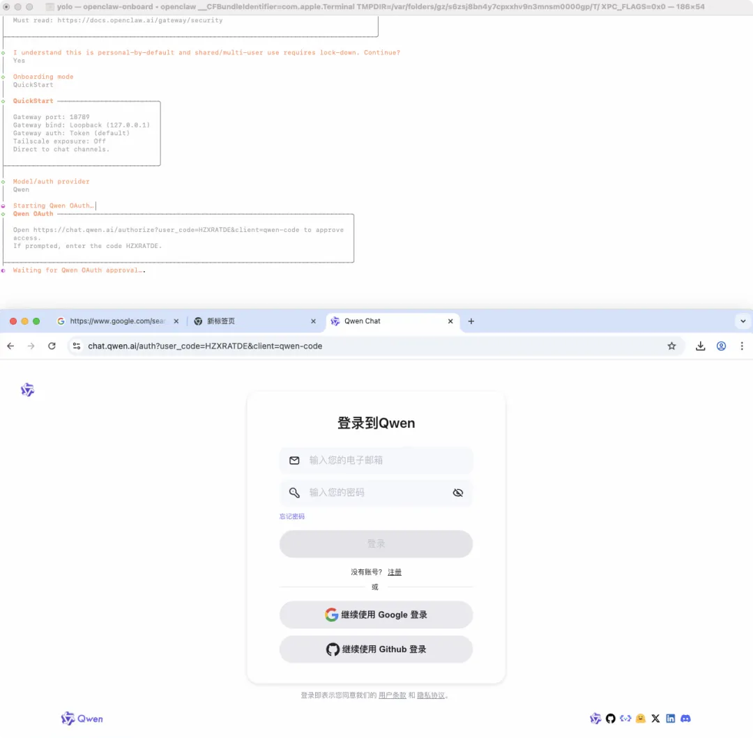 OpenClaw 内置了Qwen Portal OAuth 免费通道,登录就是完成了官方授权(官方免费额度,用完可能限用 / 收费,新人快速安装体验使用)。
