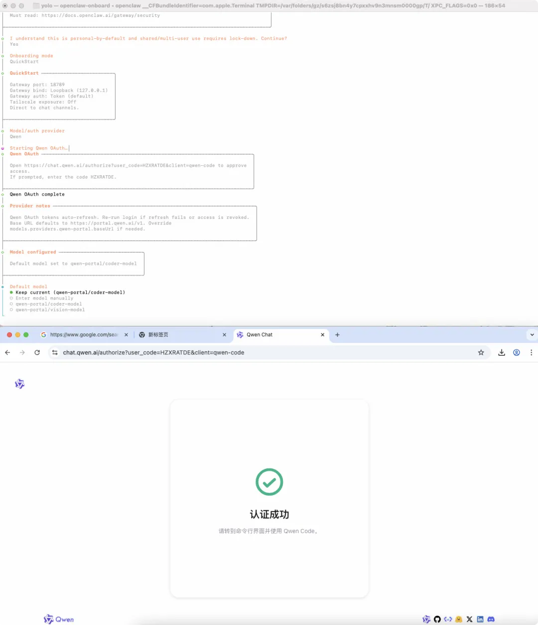 这时候会提示,进行Qwen认证,同时浏览器会打开千问Qwen认证页面,登录即可完整认证。