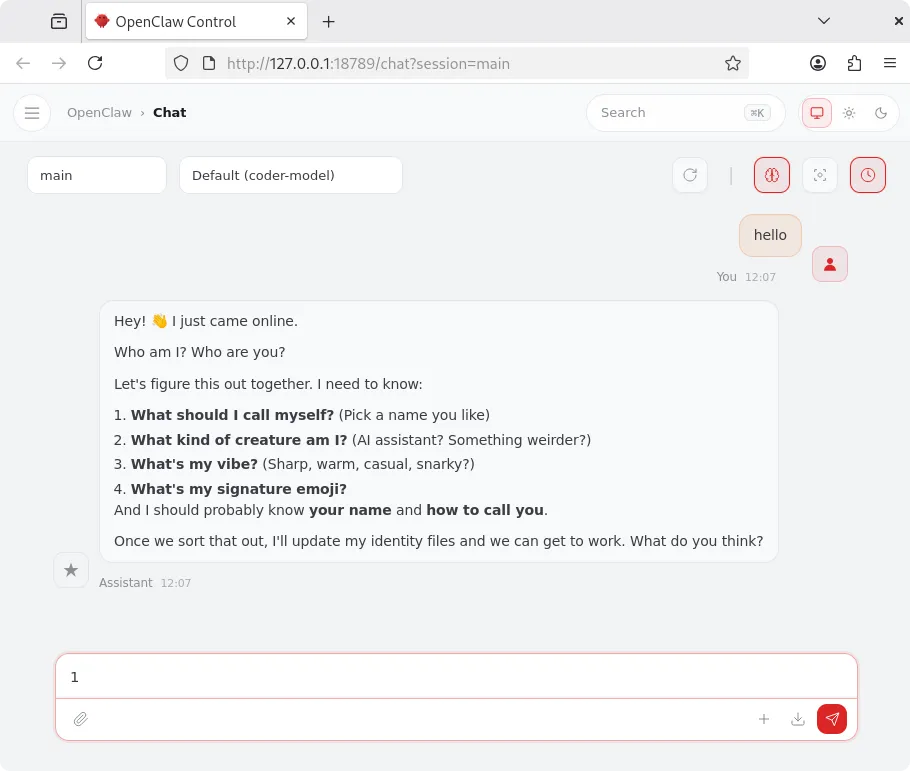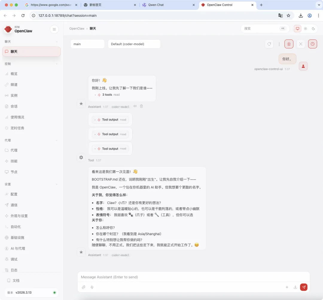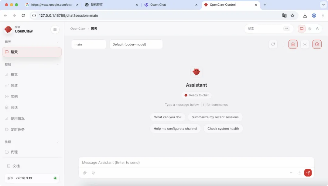 这时候会在浏览器直接打开Openclaw 的Web UI 界面。