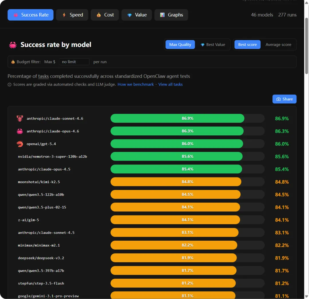 https://pinchbench.com/分别从成功率、速度、成本进行排名