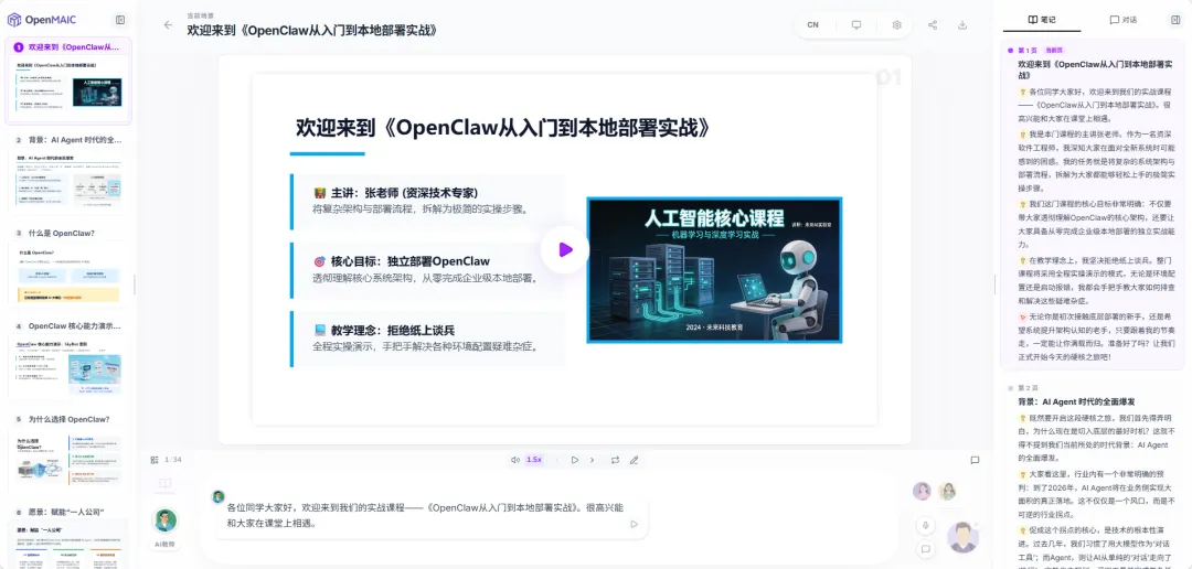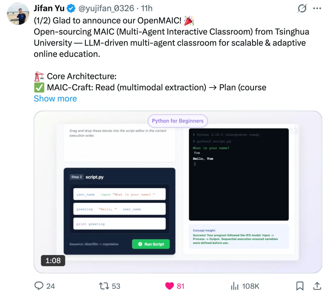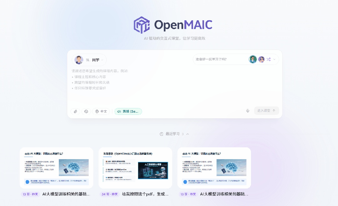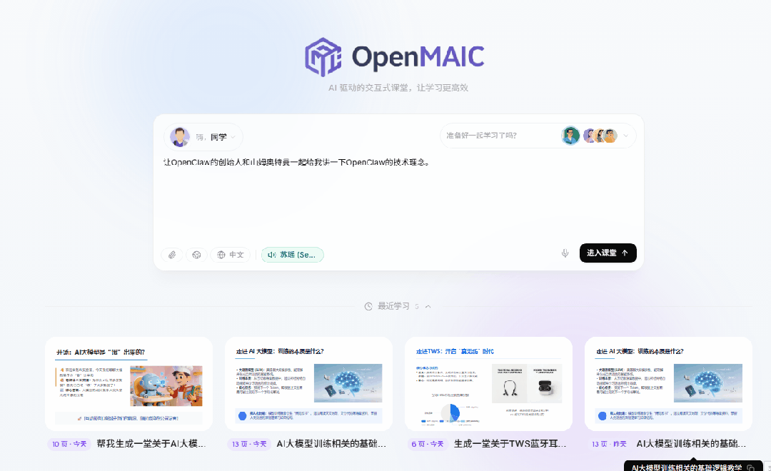 我也下单看了看,发现大多资料都是网上收集来的文章/PDF,虽然内容还行,但实在太杂,学起来如同嚼蜡,真是食之无味弃之可惜...那么问题来了,既然都已经进入AI时代了,难道就没有AI时代应有的教学方式吗?我最近发现清华大学在Github上开源了一个AI项目,它的名称是「OpenMAIC」。该项目开源仅数小时,在X上就已经引发了十几万人关注