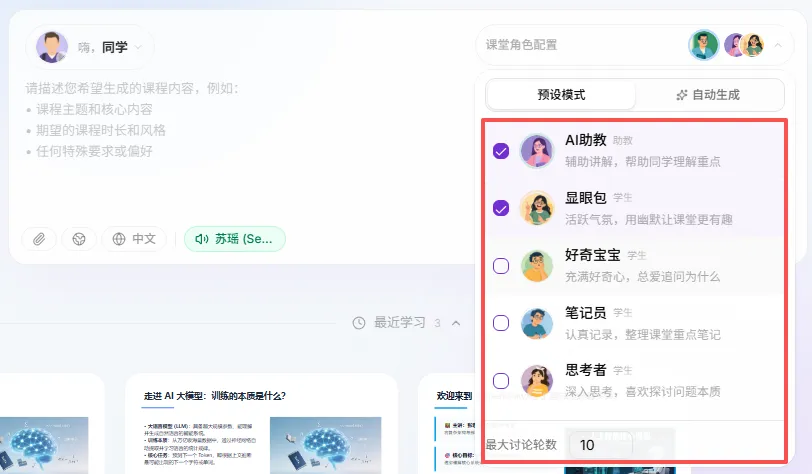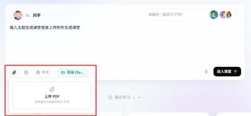 你有两种方式开启一场赛博课堂,一是直接输入你想学习的问题,AI会根据你的问题生成课堂。二是上传你要学习的PDF附件,AI会根据你提供的内容来生成课堂。