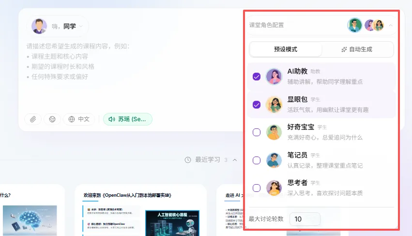 这个产品的功能很新颖,也很简单粗暴:只需要一句话,或者一份文档,就能生成一份精美的教程。正常的文档教程,咱得一个字一个字地读。就算是视频教程,咱也得一秒钟一秒钟地看,说白了都得靠咱主动去学习。而我又比较懒,虽然知道学习很重要,但依旧改不掉拖延症。但OpenMAIC这个项目,则直接生成了一间教室,有老师、有同学、有板书、有考试、甚至还有小组讨论。这直接就是把真实的课堂环境给搬到了线上