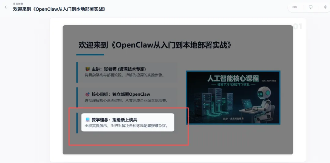 对了,你还可以把你的小龙虾(OpenClaw)接入OpenMAIC,这样一来,你只用让小龙虾帮你生成一份课程。它就能自动调用OpenMAIC生成赛博课堂。