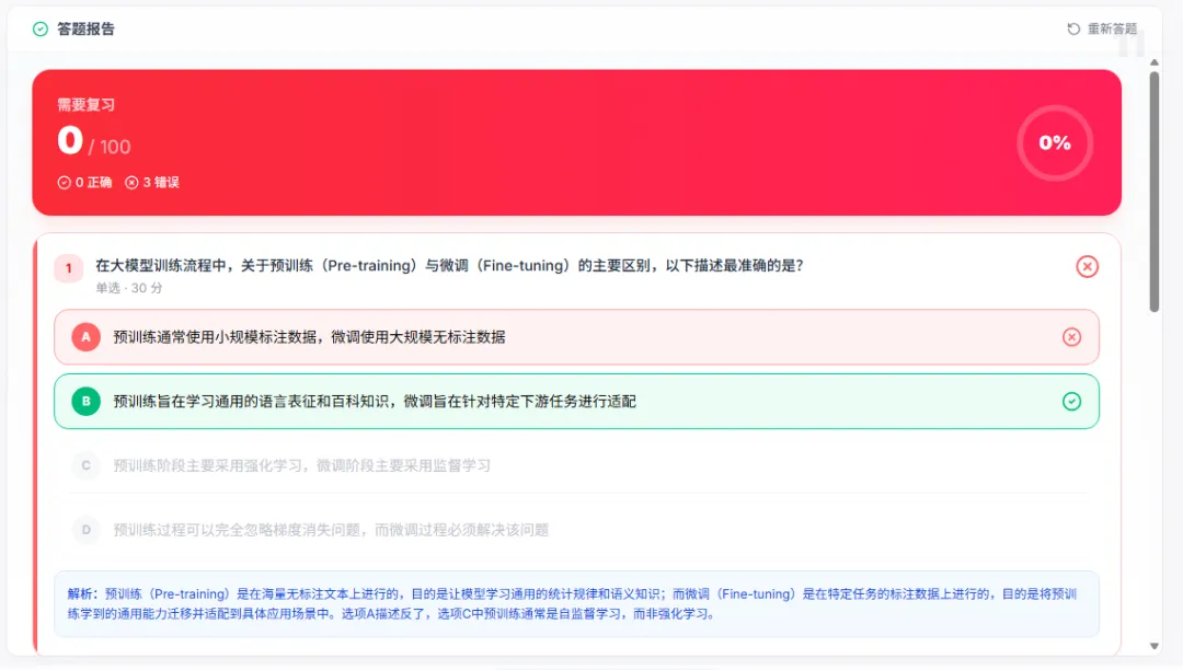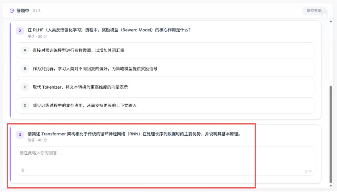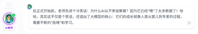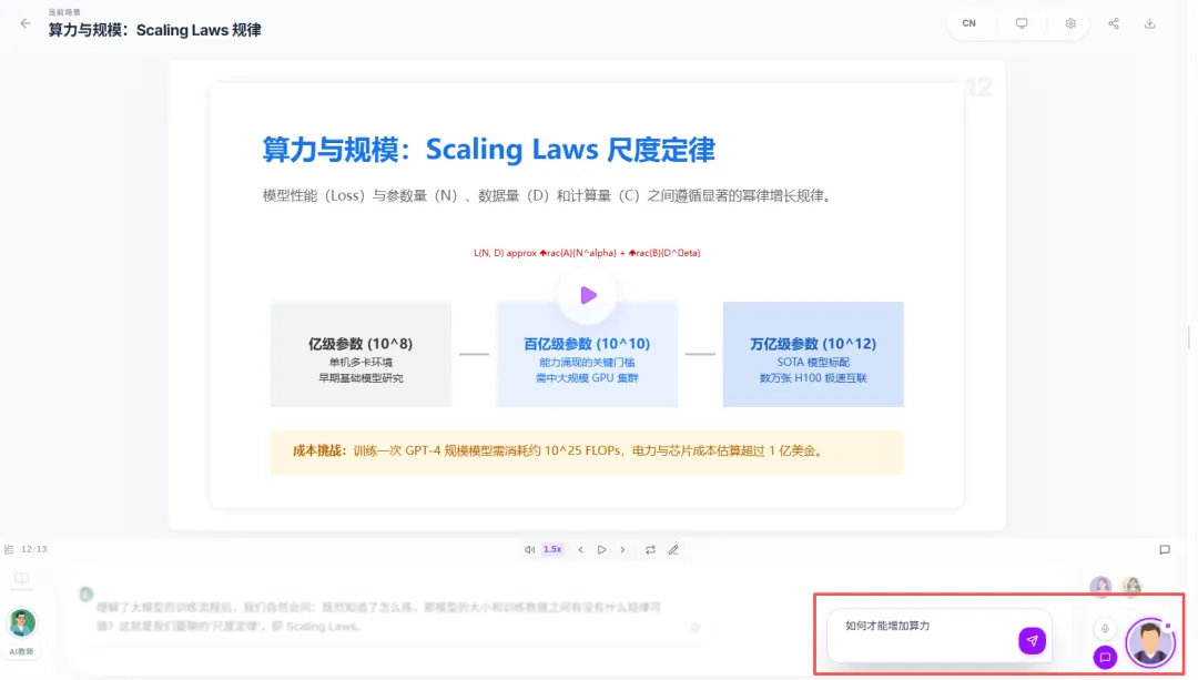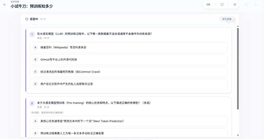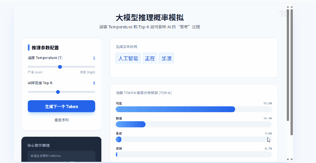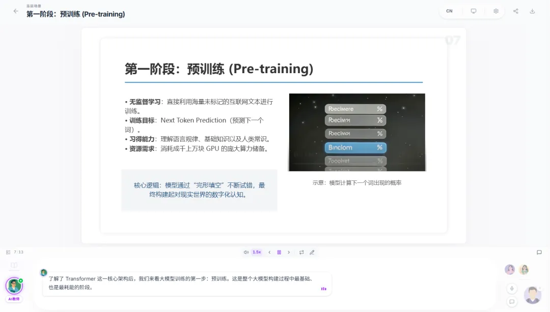 进入课堂之后,我们首先会看到一张大大的板书,并伴有一位老师在下方进行语音讲解。讲解可不只是读一读板书上的内容就完了,而是带有开场白,循序渐进地进行深入讲解。它会根据当前讲解的进度,用聚光灯的方式来引导你的注意力,让视线始终聚焦在核心知识点上。以前上课的时候,是不是经常低头看了一眼笔记,再抬头看黑板,就不知道老师讲到哪里了?而在这里,就不会有这样的问题,正在讲解的部分它会标出来。下面是一堂关于AI大模型的赛博课堂,正在讲解AI模型的训练逻辑是怎样的。它在讲完一个阶段之后,会制作出一个知识点相关的模拟器,让我操作这个模拟器来理解知识点。这堂课讲的是AI模型如何理解和学习人类语言,而模拟器则展示了如何理解大模型推理时的概率问题。通过模拟器,我们就能快速吸收知识点,毕竟听十分钟不如实操一分钟。没错,要开始检验学习成果了,上学时候有月考,现在这一堂课就能让你进行三次测试。但不用太担心,题目数量并不多,主要是针对刚刚学过的知识点进行检测,这里不只是选择题,还有这种问答题↓完成之后会有老师给你批改,错了会告诉你具体原因,并督促你赶紧“回炉重造”