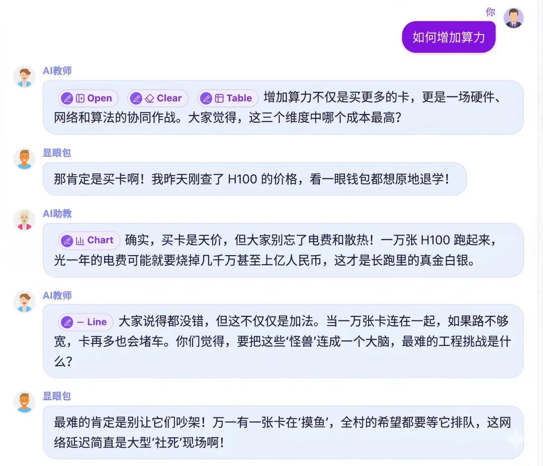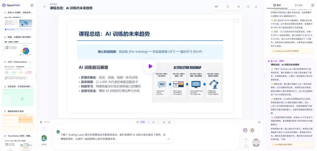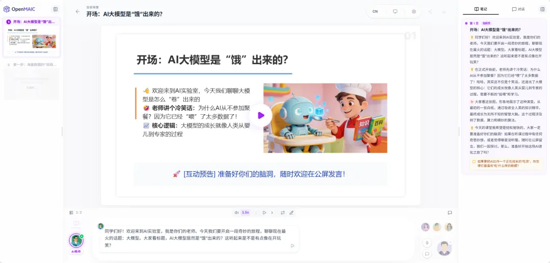 细心的朋友应该发现了,选择同学时,同学的名字也很有意思。显眼包的发言会角度清奇,好奇宝宝的发言更偏向发散思维,通过不同性格的同学互动,我们也能收获不一样的知识视角。另外,系统还支持自动生成课堂角色,你可以在创建一个课堂时,用提示词设定一个上课的场景。比如让OpenClaw的创始人和山姆奥特曼一起给你上课↓这样在创建好课堂时,AI就会自动代入这两个人的视角,给你一场有趣的赛博课堂体验了。生成的课程不仅可以自己学习,还可以通过分享链接,或把课程下载下来分享给朋友一起学习。值得注意的是,它下载的并不是只能看的文件和图片,而是元素级可编辑的PPT和交互网页。就连测试和模拟器功能都得到了保留,后期修改起来也更自由。如果你对以上功能有任何不满意的地方,你可以在Github上贡献你的想法和创意,一起将这个项目变得更好。正好我最近也想了解一下AI大模型是怎样进行训练的,于是打算用OpenMAIC尝试一下,你还别说,效果出奇的好。另外还选了一个助教和两个同学跟我一起上这堂课,接着点击“进入课堂”就开始生成了。它不是直接陈述AI大模型是如何训练的,而是用了一个有趣的比喻,用“饿”这个词来比喻AI大模型的训练方式。然后还根据这个比喻讲了一个冷笑话,额...确实挺冷的...内行人应该都知道,大模型的训练是需要投喂数据的,所以它这么讲也是有道理的。现在幽默感够了,接下来就看专业程度怎么样了