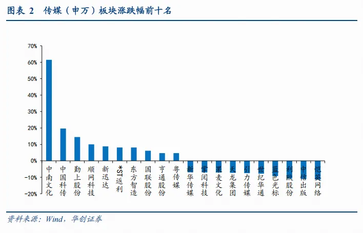 从个股看,涨幅情况:中南文化(61.51%)/中国科传(19.69%)/勤上股份(14.53%)/顺网科技(10.01%)/新迅达(8.81%)等个股领涨。跌幅情况:恺英网络(-11.44%)/中信出版(-10.99%)/利欧股份(-10.84%)/蓝色光标(-9.27%)/世纪华通(-7.79%)等个股领跌。