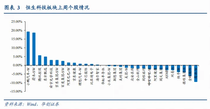 从个股看,涨幅情况:小鹏汽车-W(19.07%)/蔚来-SW(18.46%)/腾讯控股(5.49%)/东方甄选(4.75%)/舜宇光学科技(2.83%)领涨。商汤-W(-9.33%)/金蝶国际(-5.9%)/携程集团-S(-3.92%)/快手-W(-3.74%)/网易-S(-2.63%)领跌。