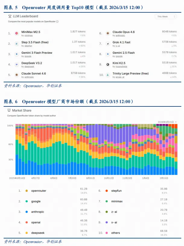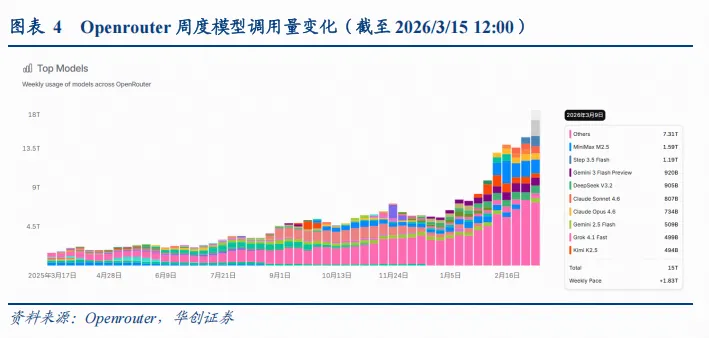 1)调用量:据Openrouter,3月9日至3月16日模型调用量预计达到16.8T tokens,周环比+14%。